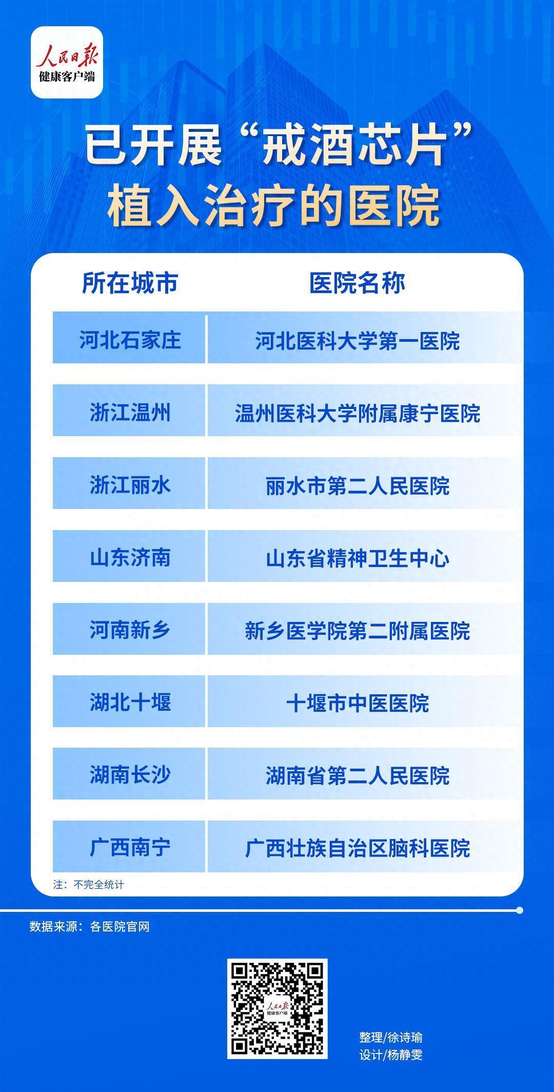 据人民日报健康客户端记者不完全统计,除湖北省十堰市中医医院外,湖南省第二人民医院、山东省精神卫生中心、河北医科大学第一医院、温州医科大学附属康宁医院等均已开展“戒酒芯片”植入治疗。